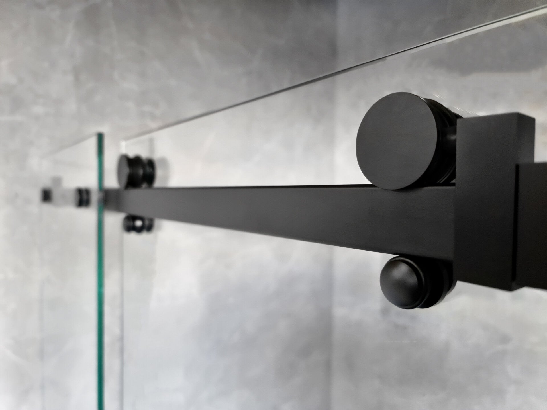 Die VERONA Duschkabine mit Schiebetüren besteht aus zwei Glaswänden und einer Glasschiebetür. Die Basis, auf der sich die Tür bewegt, ist ein stabiles Messingrohr in der Farbe Ihrer Wahl. Hochwertige, kugelgelagerte Laufrollen lassen die Kabinentür geräuschlos und leichtgängig laufen. Um die Türe abzubremsen, ist auf beiden Seiten des Rohres ein verstellbarer Endanschlag montiert.