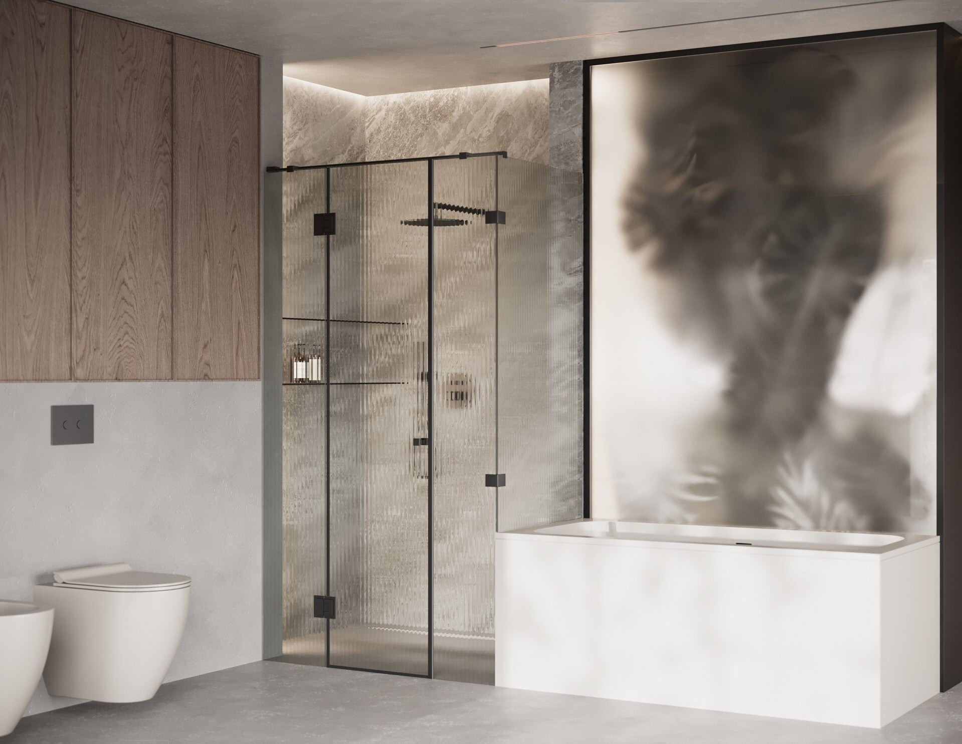 Mattierter Sichtschutzstreifen in der Mitte, der die wichtigsten Körperstellen abdeckt, oder über die gesamte Länge und Breite des Glases. Dadurch wird das Glas teilweise undurchsichtig, lässt aber Licht durch. Beim Aufmaßservice können Sie wählen, welche Variante zu Ihnen passt.