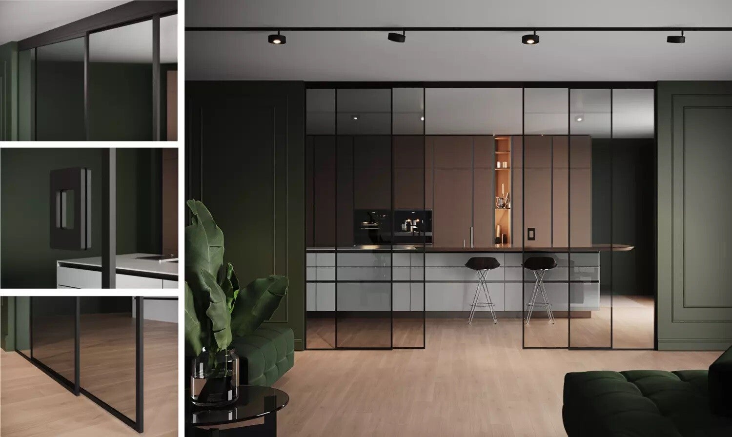 Die Glasschiebetür MONACO wird nach Maß gefertigt und kann an Wand oder Decke befestigt werden. Die maximale verfügbare Breite für dieses Doppeltürsystem beträgt 2 x 1500 mm. Die doppelte Soft-Close-Funktion der Türen ermöglicht den häufigen Einsatz im Wohnzimmer oder Schlafzimmertür.