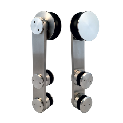 Es zeichnet sich dadurch aus, dass die Laufwagen, die die Glastür halten, am Edelstahlrohr montiert sind und das gesamte Laufsystem freiliegt. Solche Glasschiebetüren werden vor allem in Innenräumen im rohen Industriedesign, wie dem derzeit beliebten Loft-Stil, eingesetzt.